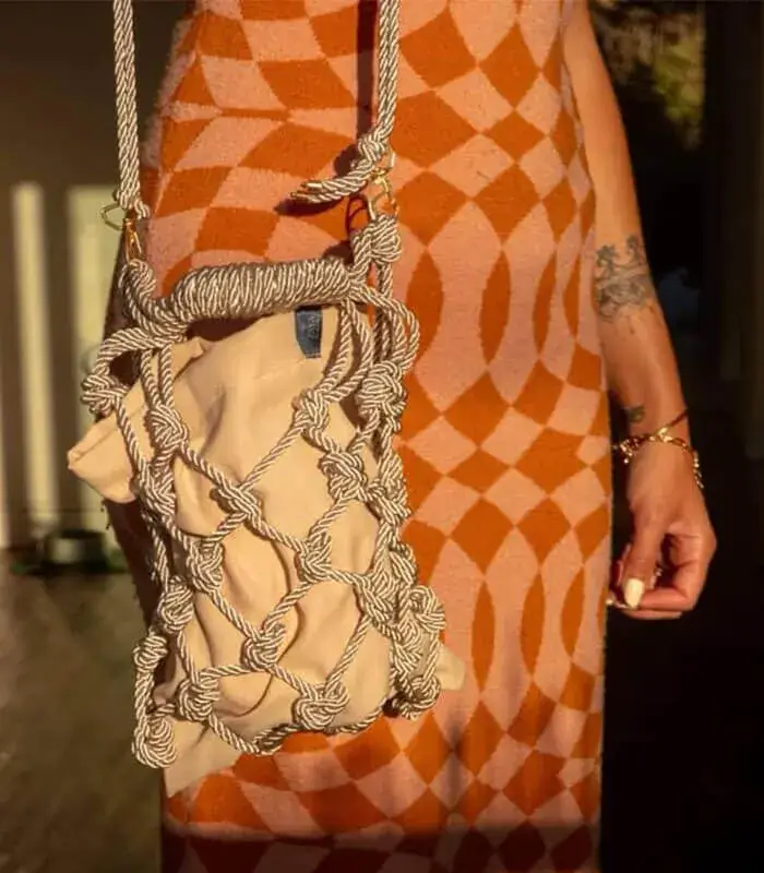 The Eva Beige Bag is all about understated elegance — handcrafted with soft blush fabric wrapped in earthy rope netting.